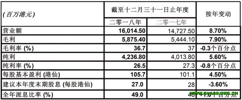 回顧二零一八財(cái)政年度,浮法玻璃、汽車玻璃及建筑玻璃業(yè)務(wù)表現(xiàn)突出,帶動(dòng)集團(tuán)營(yíng)業(yè)額上升8.7%至16,014.5百萬港元。毛利增長(zhǎng)7.9%至5,875.4百萬港元,毛利率為36.7%。集團(tuán)全年純利上升5.6%至4,236.8百萬港元,純利率為26.5%。每股基本盈利為105.7港仙。