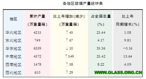 2012年一季度全國規(guī)模以上平板玻璃企業(yè)累計生產(chǎn)平板玻璃17983.6萬重量箱,比上年同期增加738萬重量箱,同比增長4.28%。各地區(qū)玻璃產(chǎn)量分布如表: