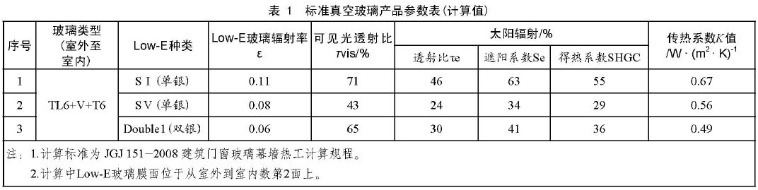 真空玻璃最基本的品種是標(biāo)準(zhǔn)真空玻璃,即一塊浮法玻璃加上一塊低輻射鍍膜玻璃(Low-E 玻璃)。北京新立基公司的半鋼化標(biāo)準(zhǔn)真空玻璃的產(chǎn)品參數(shù)如表 1 所示,從表1 中可以看出,僅是標(biāo)準(zhǔn)真空玻璃 K 值就可以達(dá)到 1.0 W/m2·K 以下,如果使用輻射率0.06 的雙銀 Low-E 玻璃標(biāo)準(zhǔn)真空玻璃 K 值可達(dá)到 0.5 以下。目前,Guardian、ST.Gobain和Interpane 等廠商生產(chǎn)的鋼化 Low-E 玻璃的輻射率已達(dá)到0.02~0.04,如果使用該性能的 Low-E 玻璃,真空玻璃的性能會(huì)更好。