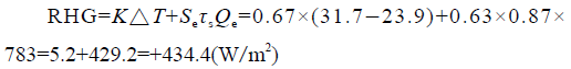 正號(hào)表示熱功率從室外傳向室內(nèi),是“得熱”。此相對(duì)增熱中將近 98.8% 是太陽(yáng)輻射(計(jì)算中的第二項(xiàng))引起的。