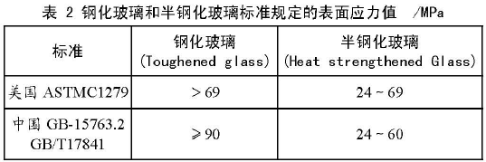 普通玻璃通過(guò)深加工處理,使玻璃表面形成壓應(yīng)力層,玻璃強(qiáng)度會(huì)大大提高,可稱為強(qiáng)化玻璃。又依表面壓應(yīng)力不同,分為鋼化玻璃和半鋼化玻璃兩個(gè)品種,其表面應(yīng)力如表 2 所示。在圖 1 所示的真空玻璃結(jié)構(gòu)中,兩片玻璃不是普通玻璃而是半鋼化玻璃,則稱為“半鋼化真空玻璃”。