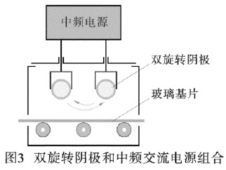目前,解決這個問題的常用方法是采用雙旋轉(zhuǎn)陰極和交流電源組合,(參見圖3),由于旋轉(zhuǎn)陰極的靶是旋轉(zhuǎn)的,靶材的刻蝕均勻的分布于整個靶筒的表面,可以避免反應(yīng)濺射中由于再沉積而形成絕緣層。另外,中頻電源分別與兩個磁控管相接,使得兩個靶互為陰陽極,并隨著中頻電源的電勢和相位每半個周期變換一次,這樣,磁控管就可以捕獲電子,改變再沉積區(qū)域的表面電勢,進而起到抑制電弧的作用。關(guān)于這一技術(shù)的詳細論述,請讀者參見文獻一。