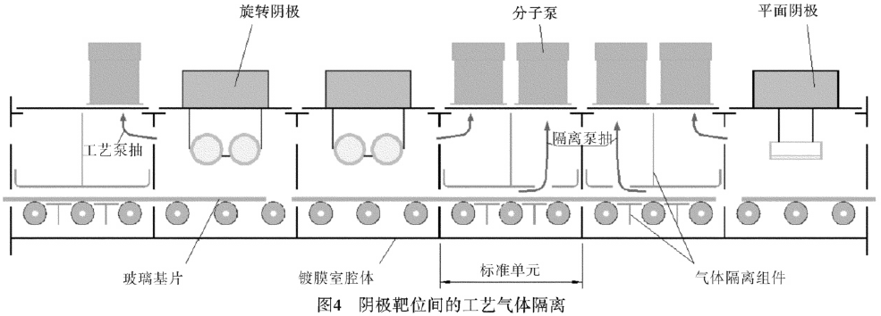 由于Low-E膜的膜系復(fù)雜,現(xiàn)代連續(xù)式鍍膜線通常布置有10~30個靶位,對于采用不同工藝氣體的濺射單元之間,應(yīng)采取嚴格的氣體隔離措施,否則會使得各靶位間產(chǎn)生不必要的交叉污染,造成膜層質(zhì)量下降。以圖4所示為例進行說明:
