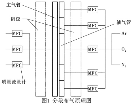 1)布氣管路分為主管和輔管,主管由3個質(zhì)量流量計分別控制Ar、O2、N2氣的供氣量,輔管根據(jù)陰極寬度分為3~7段,每段由一個質(zhì)量流量計單獨控制工藝氣體流量,見圖1。